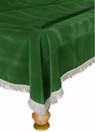 Данное покрывало для бильярдного стола изготовлено из тянущегося бархата, а по краям оно украшено бахромой. Покрывала для бильярдного стола используются уже давно, каждая игра начиналась с того, что бильярдного стола снимали покрывало. Использовались самые красивые покрывала, украшенные попоной и расшитые золотыми узорами, это торжественный момент. Сейчас в бильярдных клубах и комнатах покрывала используются не только для красоты, но еще и для защиты бильярдного стола. Сейчас покрывала изготавливаются из самых разнообразных материалов, это могут быть как самые недорогие варианты, так и покрывала из шелка, бархата и велюра.