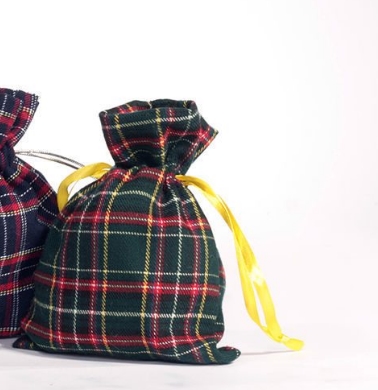 Шотландкой называют ткань из натурального шерстяного, или хлопчатобумажного волокна. Также шотландка может изготавливаться из синтетических материалов. У такой ткани узор, который знают все, это шотландская клетка. Несмотря на то, что дизайн таких мешочков довольно классический, мешочки из шотландки выглядят максимально стильно, они всегда популярны.