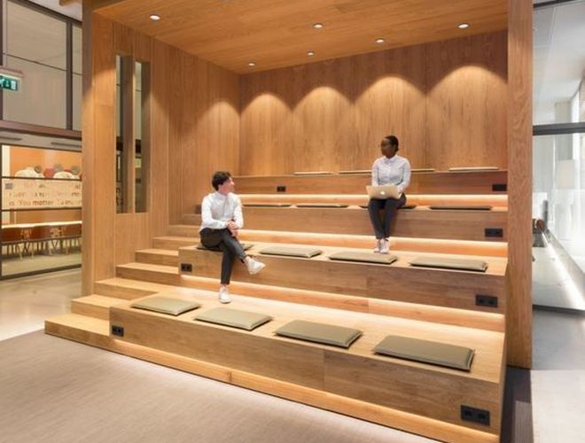 Все больше общественных пространств оформляются с учетом принципа колизея: наличие ступеней, которые могут служить не только для прохода, но и для удобного приседания. Такой подход применяется в аудиториях, классах, различных залах и даже местах ожидания, где важно сохранить пространство и обеспечить возможность перехода на другой уровень.