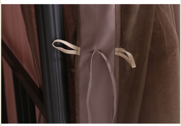 Комплект выполнен из водоотталкивающего полиэстера, имеет антимоскитную сетку 6 шт и плотные боковые шторы 6 шт и тент-крышу. Москитные сетки и шторы имеют удобные застежки-молнии.