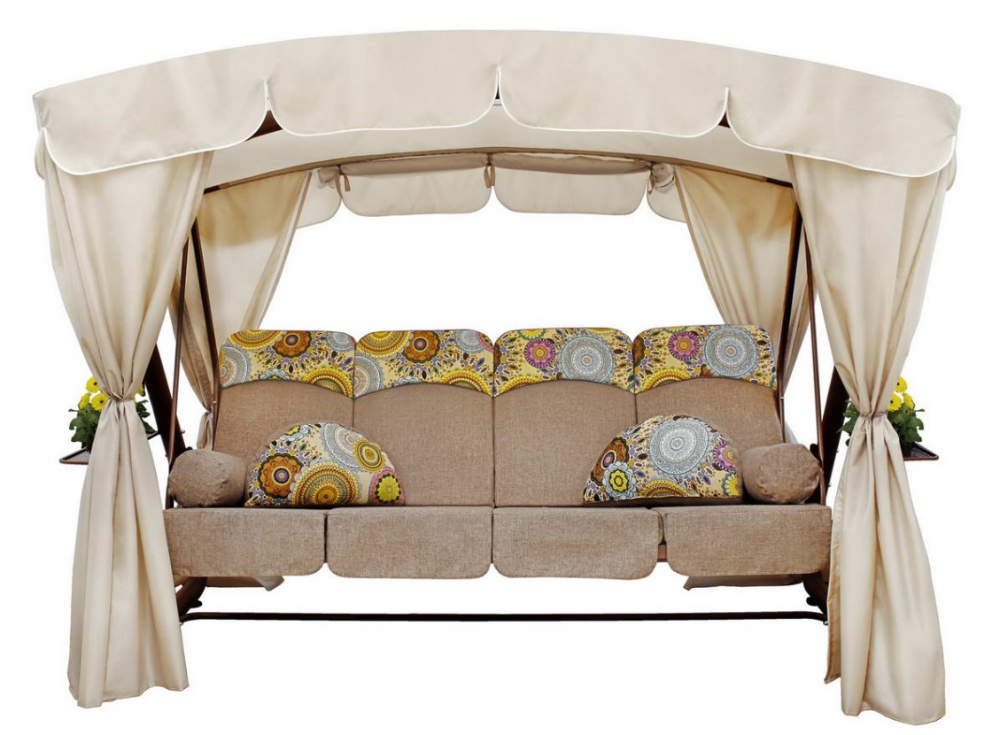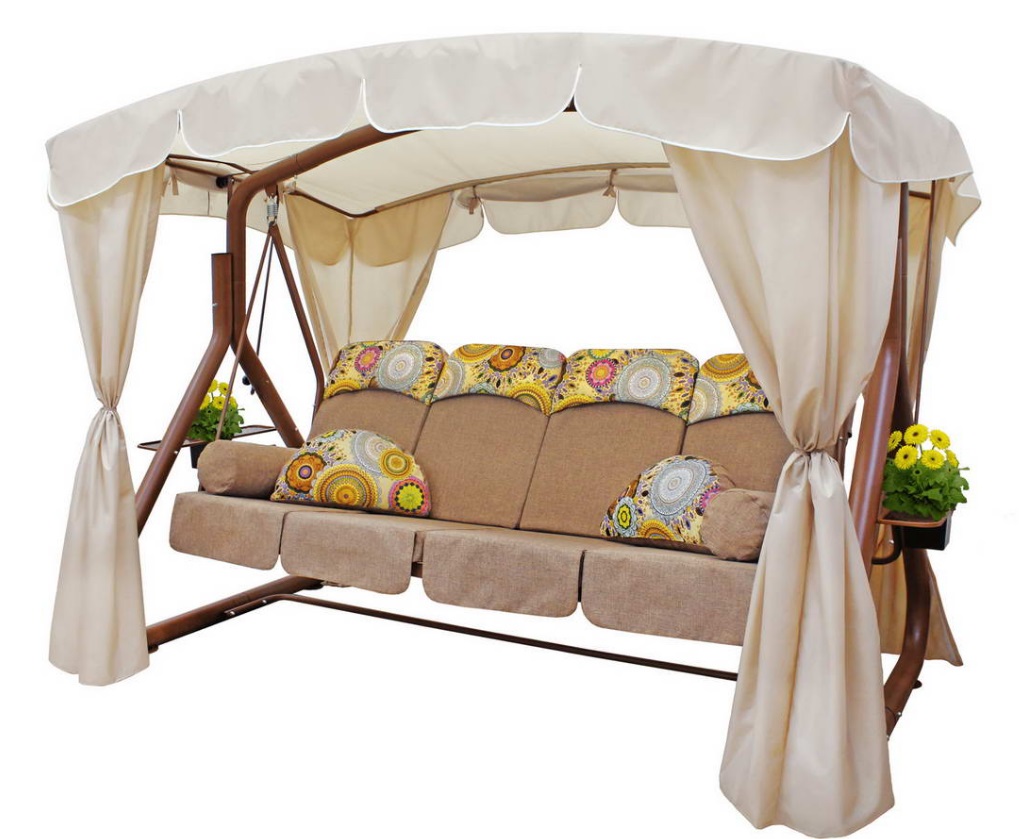 Тент, предназначенный для садовых качелей отлично может защитить от осадков. Это очень важно, так как краска на металлических частях качелей может трескаться и облазить, а металл во время контакта с влагой подвергается воздействию коррозии. Повреждается лакокрасочное покрытие из-за ультрафиолетовых лучей, в данном случае краска начинает шелушиться и отпадать, а цвет будет не таким ярким. Кроме того, выгорать могут и мягкие элементы, они быстро теряют свой презентабельный внешний вид. Именно из-за этого нужно использовать тент, предназначенный для садовых качелей. Кроме того, иногда в комплекте с таким тентом идёт москитная сетка, которая дополнительно сможет защитить вас от надоедливых насекомых. , Абсолютно все качели, которые дополнены таким тентом, обретают очень привлекательный внешний вид. Крыша может быть изготовлена из разных материалов, кроме того, она может иметь разные размеры и цвета. Помните о том, что мы также занимаемся изготовлением продукции на заказ.