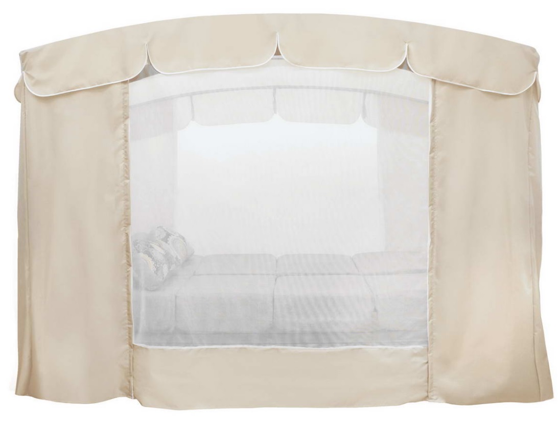 У нас вы можете приобрести тент с москитной сеткой, предназначенной для четырёхместных садовых качелей, вес данного тента составляет 0,8 кг, предназначен он для размеров по каркасу крыши 257 х 171 см. Для изготовления тента использовалась ткань Оксфорд 210 с пропиткой. У данного тента бежевый цвет, ткань является синтетической, она устойчивая к загрязнениям. Антимоскитная сетка очень удобно застёгивается на молнии.