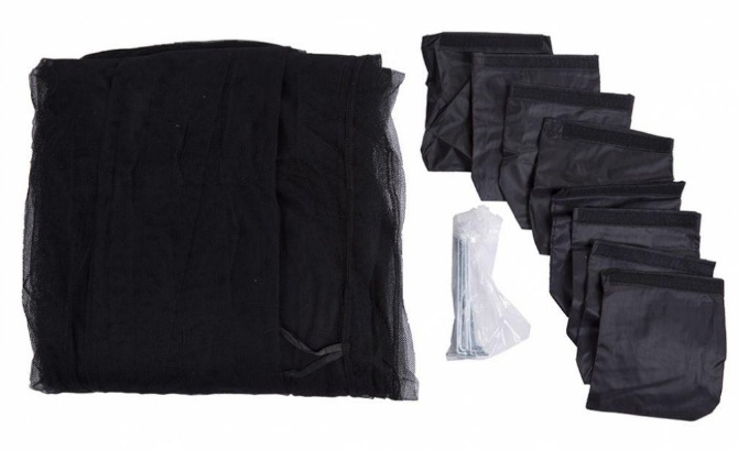 Противомоскитная сетка прикреплена мешочками (14,7х14,7 см, 8 шт.), Которые заполнены песком и насадками (с помощью липучки) на дне противомоскитной сетки, чтобы загрузить ее.